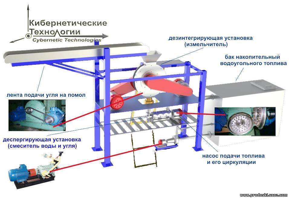 Система подачи и подготовки угля ,дробилка молотковая, дезинтегрирующая установка, TDA блок, бункер дробилки с тензорезистивным дозатором, циркуляционный насос , циркуляционная емкость с дозатором, насос подачи топлива, компрессор воздушный, горелки – МУФЕЛЬ, запорная трубопроводная арматура, система дозирования воды, реагента, автоматизированная пультовая.
